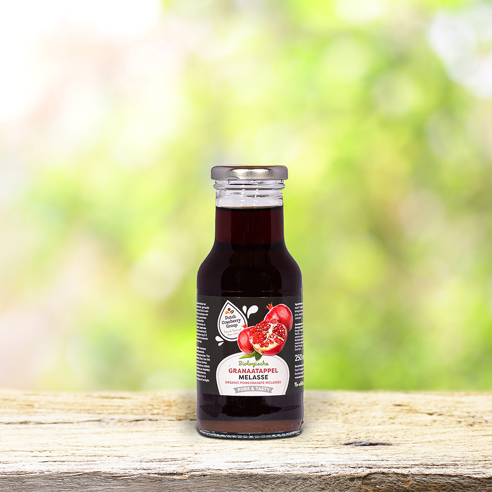 Onze melasse wordt op ambachtelijke wijze bereid van biologische granaatappels en vers geperst en gebotteld in ons bedrijf. Er worden vanzelfsprekend geen geur-, kleur- en smaakstoffen aan onze melasse toegevoegd. De melasse is niet gemaakt van geconcentreerd sap en dat proeft U. Door gebruik te maken van een speciaal productieproces behoud de melasse zeker 2 jaar haar natuurlijke smaak en vitamines. De melasse is verpakt in een doorzichtig glazen flesje van 0.25 L en voorzien van een BPA-vrije sluiting.